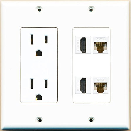 RiteAV (2 Gang Decorative) 15A Power Outlet 2 HDMI 2 Cat6 White Wall Plate White