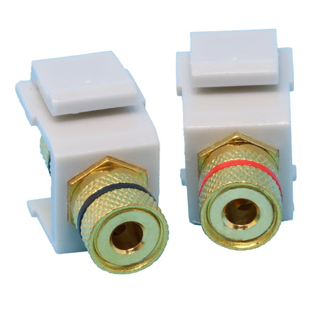 Details: RiteAV Female to Female Banana Jack Keystone Couplers are the same on the front and back, so you can connect your Speaker Wire to them in no time. They're color-coded red and black on the front and back side of the coupler, so that polarity can be easily identified. Simply plug your terminated wire into the front and back the same way. No tools are required. If you're using bare wire, you may unscrew the caps and use the binding posts to terminate bare wire. The Gold Plated Binding Post provides a reliable connection providing superior conductivity and sharp audio. The couplers are universally designed to easily fit standard-sized brand name keystone blank wall plates and fit seamlessly into all RiteAV Blank Wall Plates as well. Our Banana Jack Keystone Couplers can also be used in surface mount boxes and patch panels that have standard-sized openings. RiteAV Keystone Couplers are removable to allow for easy upgrades or plate re-configurations in the future. The sturdy construction of our couplers ensure a long service life and a simple, affordable way to keep your cables hidden. They also provide a neat, convenient way to extend cables that are already in place, without the need for relocating them. This discreet solution enables you to route your wiring through the walls and results in a clean, professional look behind wall mounted televisions, monitors, projectors and entertainment centers in both residential (home theater) and commercial (classroom, boardroom, factory floor, recording studio, etc.) settings. Please note that Speaker Wire is not included with the product. It is referenced as an item that the Banana Jacks may be used with. Our 2 Pack includes 2 units (1 x Banana Keystone Coupler with a Black Ring and 1 x Banana Keystone Coupler with a Red Ring). The 2 Pack is designed for use with one speaker, so please purchase additional packs if your setup includes multiple speakers.