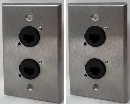 RiteAV's 2 Port Cat6 D Series Heavy Duty Pass Through Solderless Stainless Steel Wall Plate is configured with D Series Chassis Panel Mount Couplers which are durably constructed to withstand wear and tear in residential applications as well as in commercial settings like offices, hotels, dormitories and airports. This discreet solution enables you to route your cabling through the walls and results in a clean, professional look behind wall mounted televisions, monitors, projectors and entertainment centers in both residential (home theater) and commercial (classroom, boardroom, factory floor, recording studio, auditorium, concert hall and theater etc.) settings. The feed through design enables pre-terminated cables to plug into both sides of the coupler the same way. No soldering or additional tools are required; just plug and play. The single body robust design of the couplers provides a reliable, stable connection for residential, industrial and commercial-grade audio, video and network connections. Mounting screws are included.