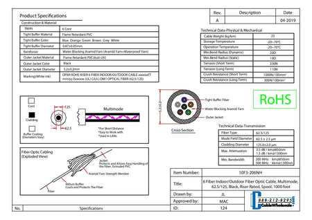 CableWholesale 6 Fiber Indoor/Outdoor Fiber Optic Cable, Multimode, 62.5/125 Micron, Black, Riser Rated, Spool, 1000 feet