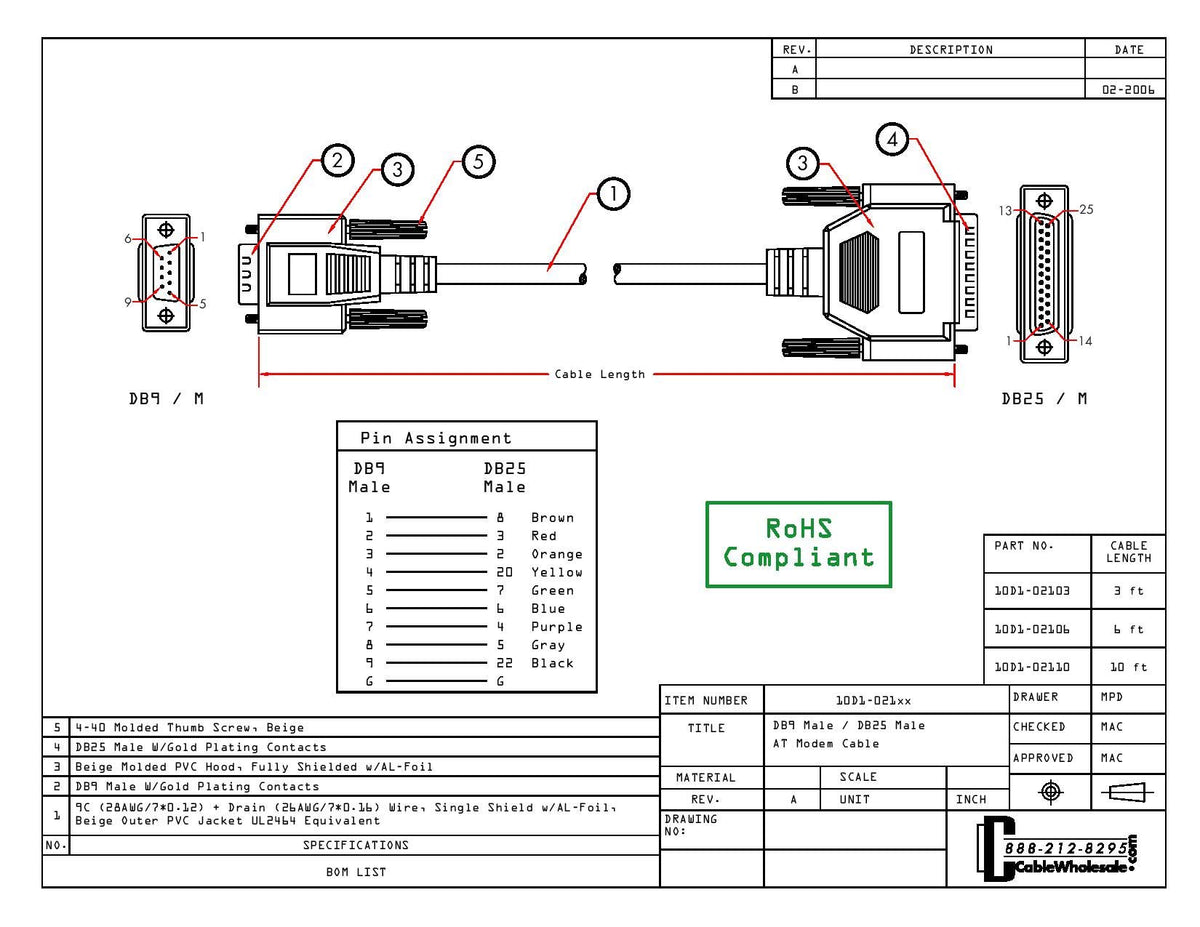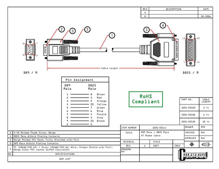 Details: Our 6 foot high quality serial cable features molded connectors and gold Plated contacts for superior corrosion resistance ensuring a solid connection for the life of the cable. The connectors are DB9 Male to DB25 male supporting 9 conductors. This cable is ideal for connecting 25 pin serial devices to laptops, computers and expansion/interface cards that have a 9 pin serial port. This male to male serial cable is solidly constructed, UL rated and RoHS compliant.