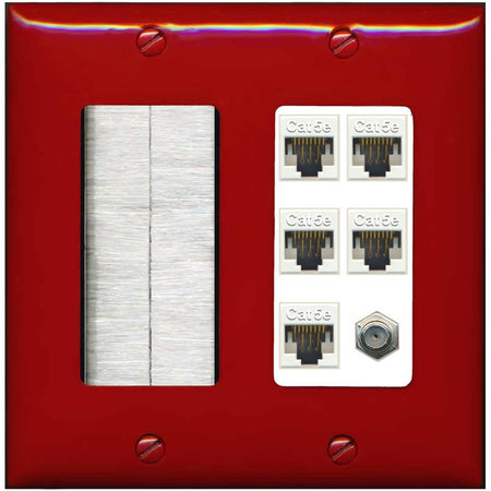 RiteAV 5 Port Cat5e Ethernet and 1 x Coax Wall Plate - Brush [Red/White]