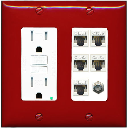 RiteAV 5 Port Cat5e Ethernet and 1 x Coax Wall Plate - GFCI Outlet [Red/White]
