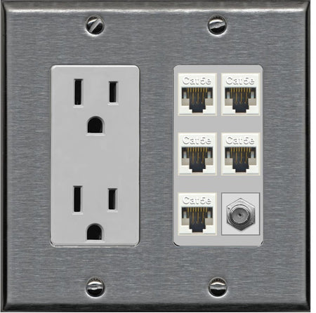 RiteAV 5 Port Cat5e Ethernet and 1 x Coax Wall Plate - Outlet [Stainless/Gray]