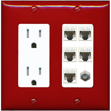 RiteAV 5 Port Cat5e Ethernet and 1 x Coax Wall Plate - Tamper-Resistant Outlet [Red/White]