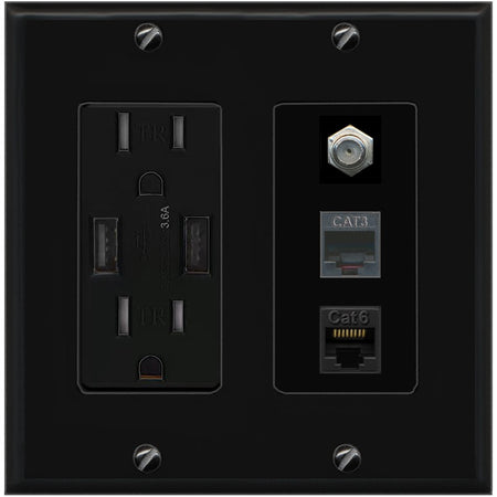 RiteAV 1 Port CAT6 Ethernet Coax Phone Wall Plate - USB Outlet [Black/Black]