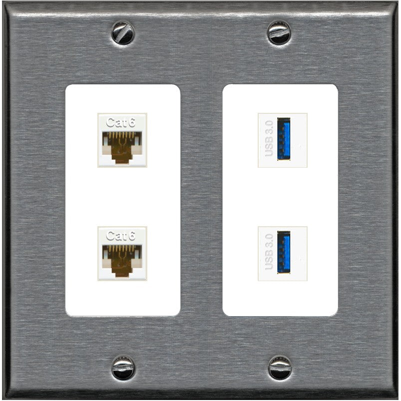 RiteAV 2 Port Cat6 2 USB3 Wall Plate - 2 Gang [Stainless/White]
