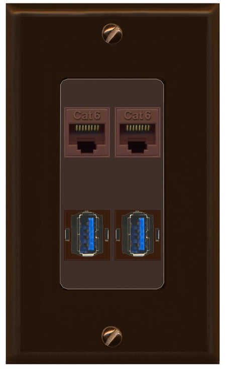 RiteAV 2 Port Cat6 2 USB3 Wall Plate - 1 Gang Decorative [Brown/Brown]