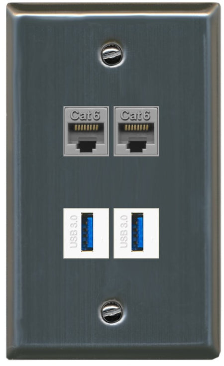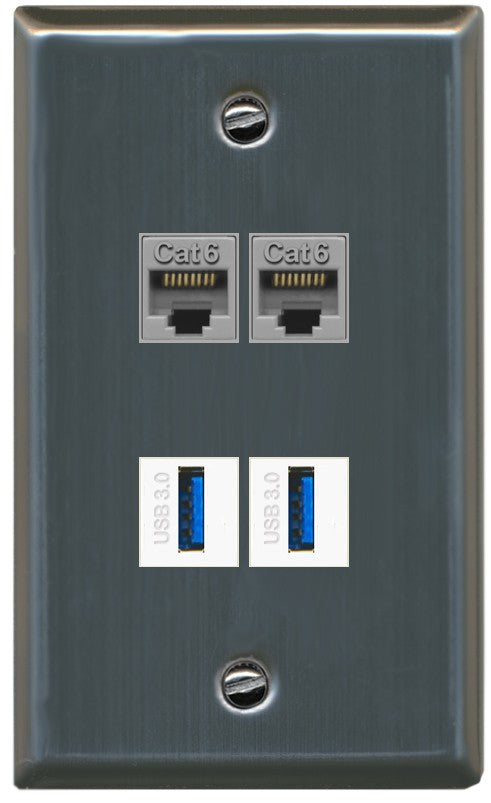 RiteAV 2 Port Cat6 2 USB3 Wall Plate - Flat Style [Stainless Steel]
