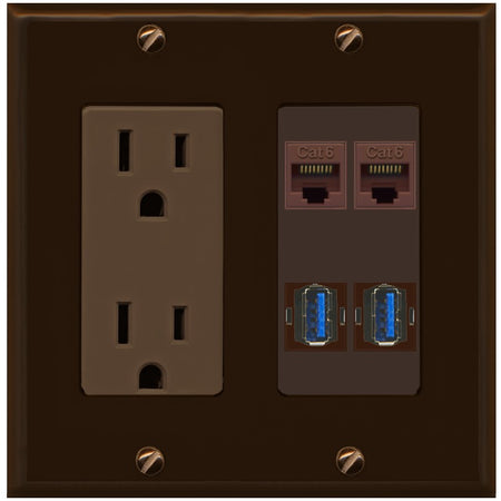 RiteAV 2 Port Cat6 2 USB3 Wall Plate - Outlet [Brown/Brown]