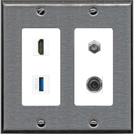 RiteAV HDMI and Coax USB3 + 3.5mm Jack Wall Plate - 2 Gang [Stainless/White]