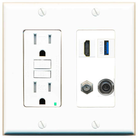 RiteAV HDMI and Coax USB3 + 3.5mm Jack Wall Plate - GFCI Outlet [White]