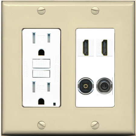 RiteAV 2 Port HDMI 1 Toslink 3.5mm Jack Wall Plate - GFCI Outlet [Ivory/White]