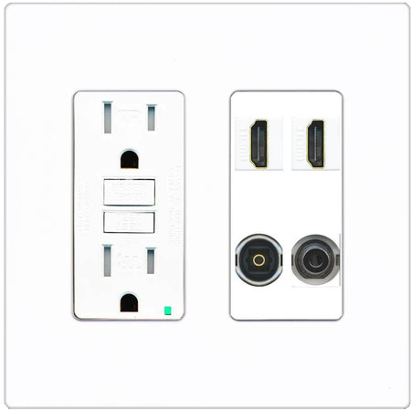 RiteAV 2 Port HDMI 1 Toslink 3.5mm Jack Wall Plate - GFCI Outlet [Screwless White]