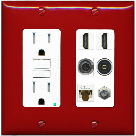 2 Port HDMI 1 Coax CAT6 3.5mm Toslink Jack Wall Plate - GFCI Outlet [Red/White]