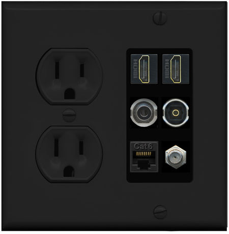 2 Port HDMI 1 Coax CAT6 3.5mm Toslink Jack Wall Plate - Round Outlet [Black/Black]