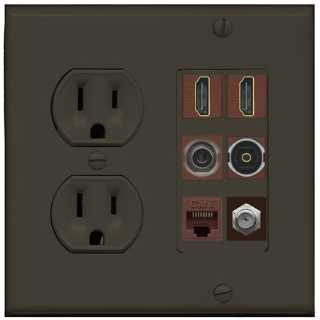 2 Port HDMI 1 Coax CAT6 3.5mm Toslink Jack Wall Plate - Round Outlet [Brown/Brown]