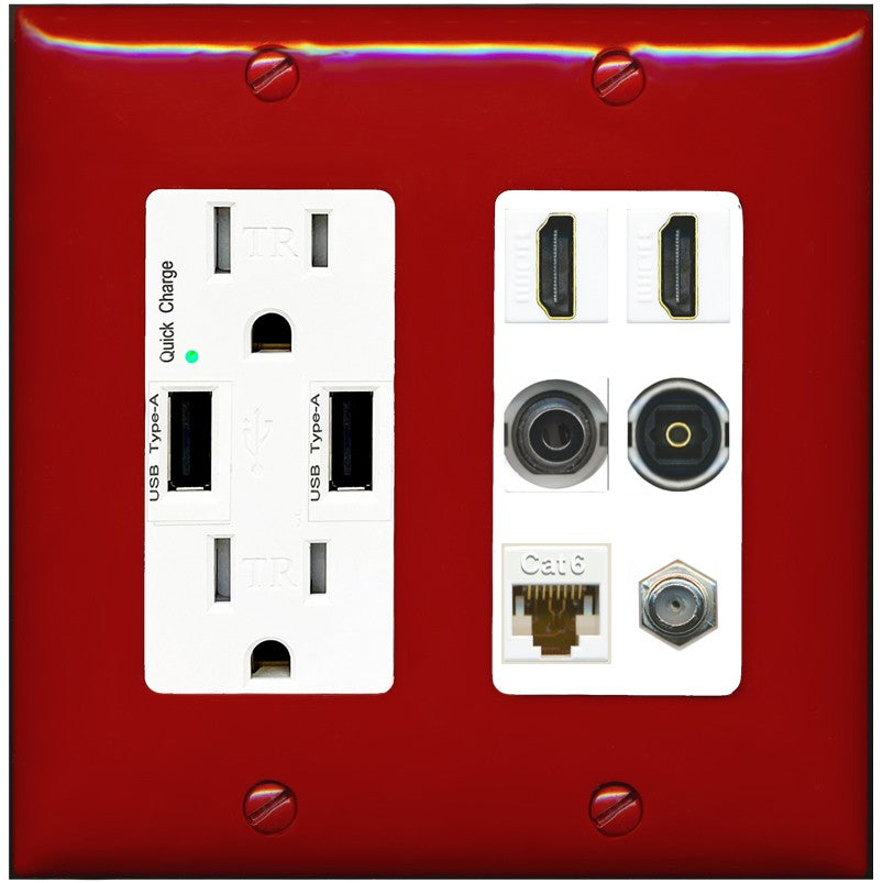 2 Port HDMI 1 Coax CAT6 3.5mm Toslink Jack Wall Plate - USB Outlet [Red/White]