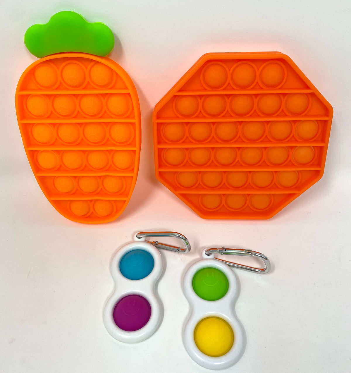 We include 1 each of a Blue/Purple and Green/Yellow Two-Finger Bubble Dots Toy that fits right in your pocket so they're completely portable. The clip can also be attached to a variety of bags, lanyards, dog leashes or even your belt loop. Children and adults alike can enjoy the safe and stress-free enjoyment that our fidget toys provide.