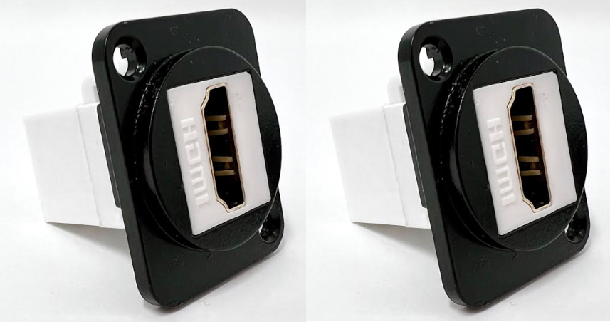 This particular D Series Coupler has a black metal housing (alternate colors are available) and accepts an HDMI Cable on the front and back side of the coupler. The HDMI 2.0 Coupler supports supports 4K resolution at 60 FPS is backwards compatible to HDMI 1.3a, 1.3b, and 1.4. In addition to this model in which the cable would exit straight out the back of the coupler (180 degrees), we offer other models in which the cable exits up/down out of the back of the plate and a model which has a integrated pigtail on the backside to accommodate situations where depth is a concern as since it allows the cable orientation to be manipulated rather than requiring 90/180 degree connections.