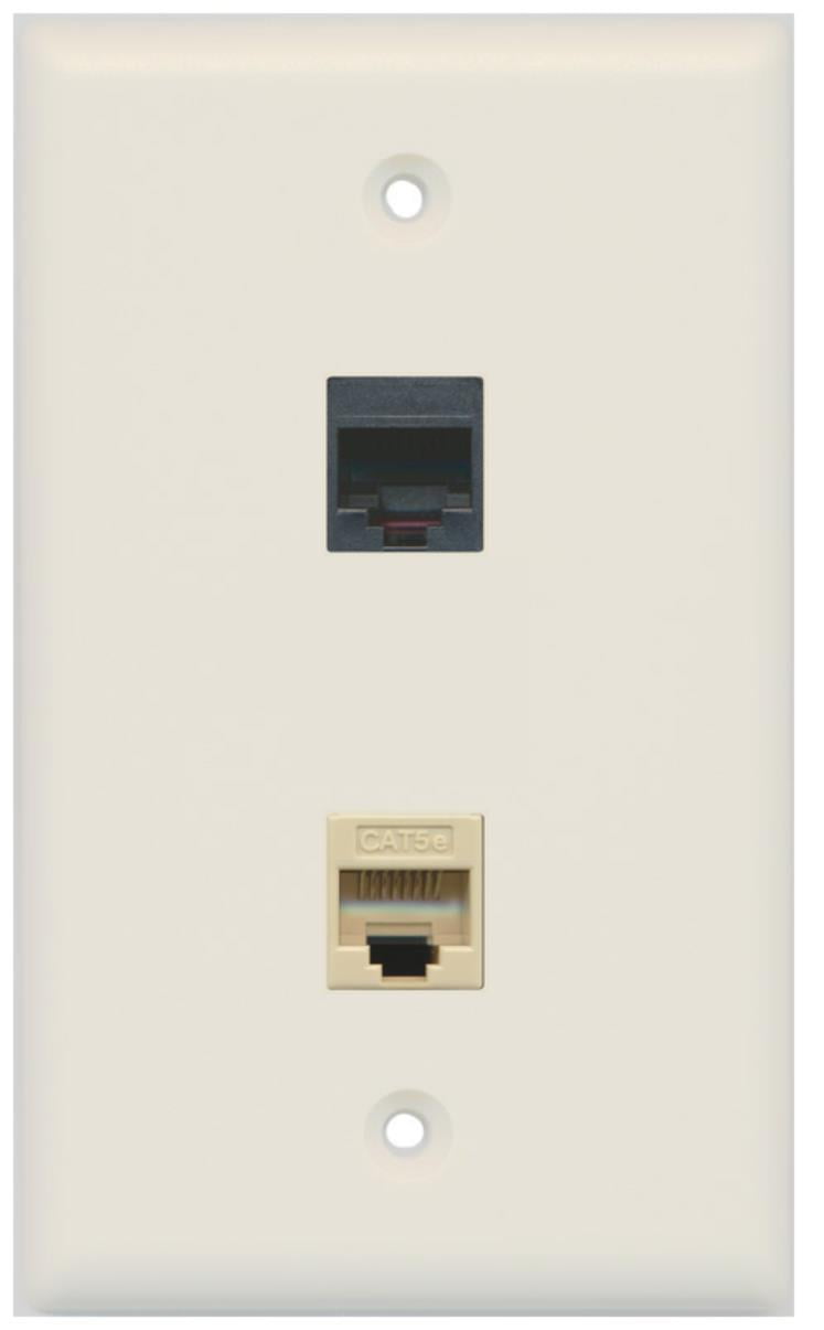 RiteAV - 1 RJ11 RJ12 Black Phone Port and 1 Cat5e Ethernet Port Wall Plate - Light Almond - Bracket Included