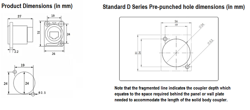 RiteAV’s D Series Chassis Panel Mount Couplers are universally compatible with the pre-punched holes on D Series rack panels and wall plates that can accommodate the D-style connector. The countersunk holes on the diagonal corners of the coupler align perfectly with the preconfigured holes on the panels and plates for a seamless fit and simple installation.
