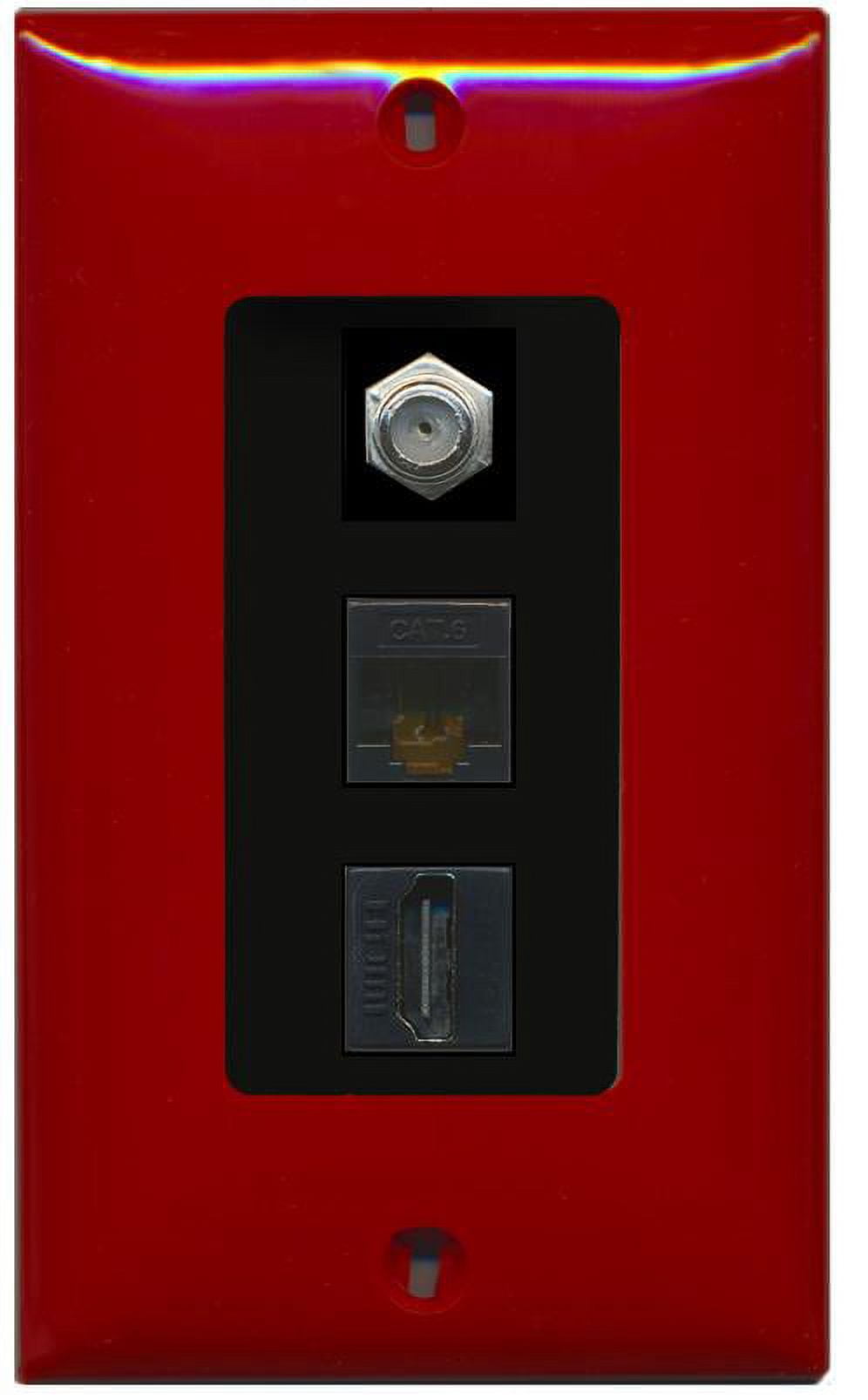 RiteAV Decorative 1 Gang Wall Plate (Red/Black) 3 Port - Coax (Black) Cat6 (Black) HDMI (Black)