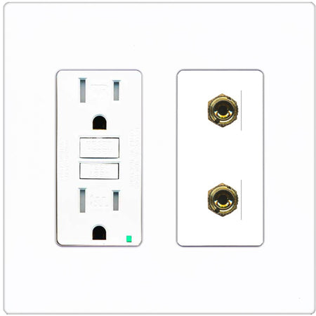 RiteAV 2 Banana 1 Speaker Surround Female Coupler Binding Post Wall Plate - GFCI Outlet [Screwless White]