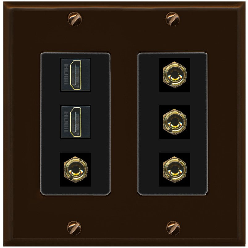 RiteAV 2 Speaker 4 Banana Binding Post Wall Plate with 2 HDMI Jacks - 2 Gang [Brown/Black]