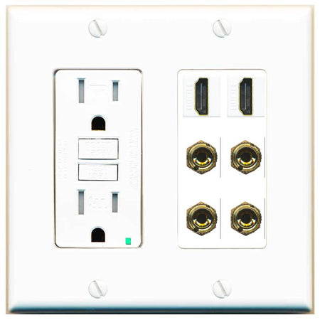 RiteAV 2 Speaker 4 Banana Binding Post Wall Plate with 2 HDMI Jacks - GFCI Outlet [White]