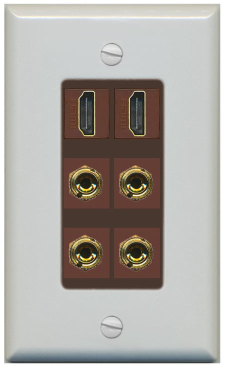 RiteAV 2 Speaker 4 Banana Binding Post Wall Plate with 2 HDMI Jacks - 1 Gang Decorative [Gray/Brown]
