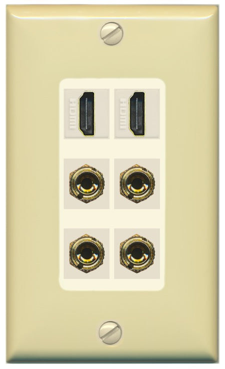 RiteAV 2 Speaker 4 Banana Binding Post Wall Plate with 2 HDMI Jacks - 1 Gang Decorative [Ivory/Light-Almond]