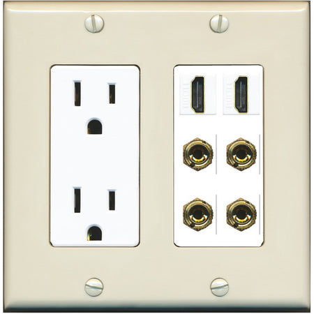 RiteAV 2 Speaker 4 Banana Binding Post Wall Plate with 2 HDMI Jacks - Outlet [Light-Almond/White]