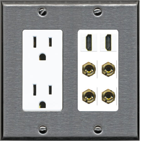 RiteAV 2 Speaker 4 Banana Binding Post Wall Plate with 2 HDMI Jacks - Outlet [Stainless/White]