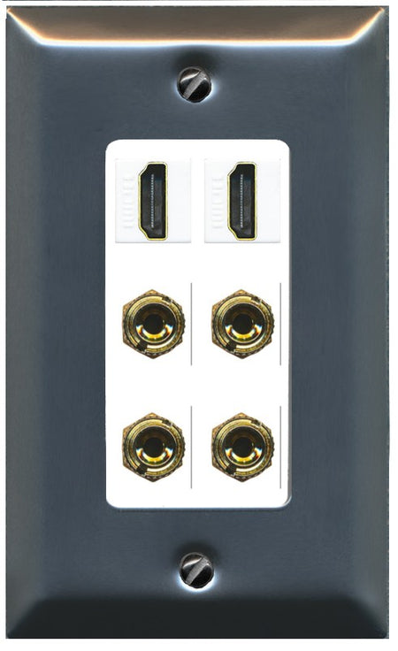 RiteAV 2 Speaker 4 Banana Binding Post Wall Plate with 2 HDMI Jacks - 1 Gang Decorative [Stainless/White]