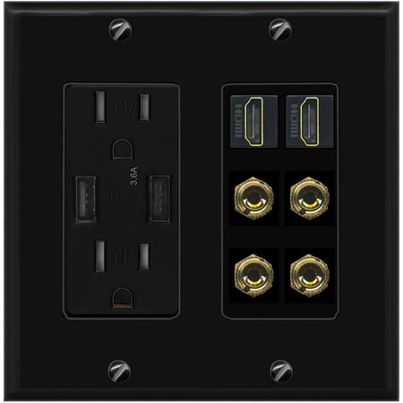 RiteAV 2 Speaker 4 Banana Binding Post Wall Plate with 2 HDMI Jacks - USB Outlet [Black/Black]