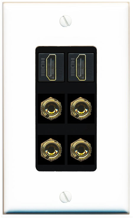 RiteAV 2 Speaker 4 Banana Binding Post Wall Plate with 2 HDMI Jacks - 1 Gang Decorative [White/Black]