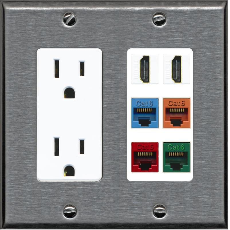 RiteAV 2 HDMI 4 Cat6 Ethernet Mixed Color Wall Plate - Outlet [Stainless/White]