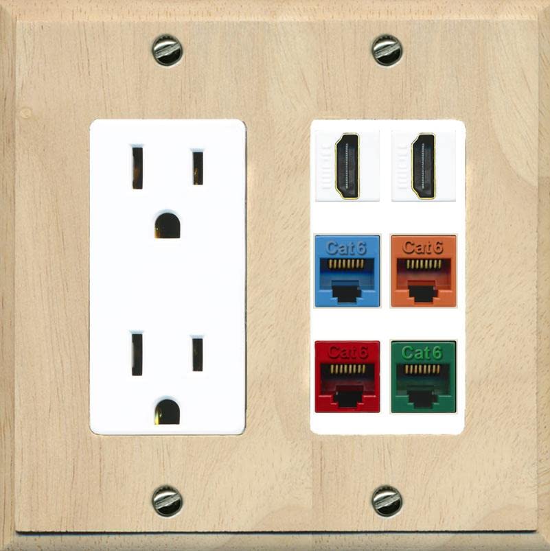 RiteAV 2 HDMI 4 Cat6 Ethernet Mixed Color Wall Plate - Outlet [Wood/White]