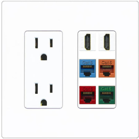 RiteAV 2 HDMI 4 Cat6 Ethernet Mixed Color Wall Plate - Outlet [Screwless White]
