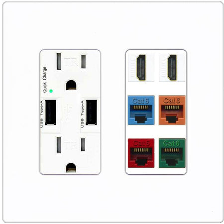 RiteAV 2 HDMI 4 Cat6 Ethernet Mixed Color Wall Plate - USB Charger [Screwless White]