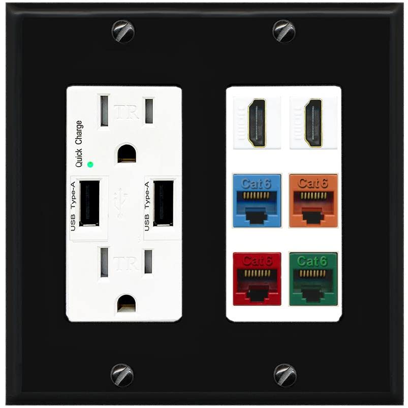 RiteAV 2 HDMI 4 Cat6 Ethernet Mixed Color Wall Plate - USB Charger [Black/White]