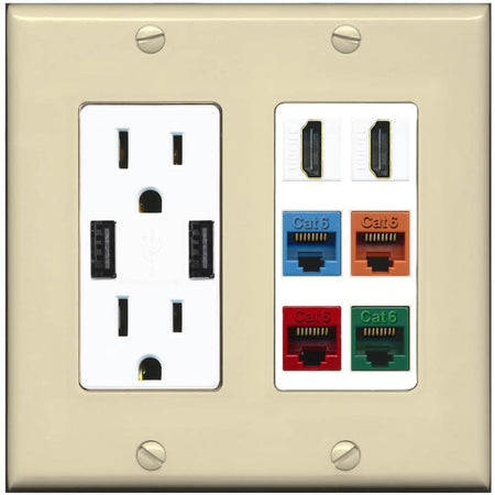 RiteAV 2 HDMI 4 Cat6 Ethernet Mixed Color Wall Plate - USB Charger [Ivory/White]