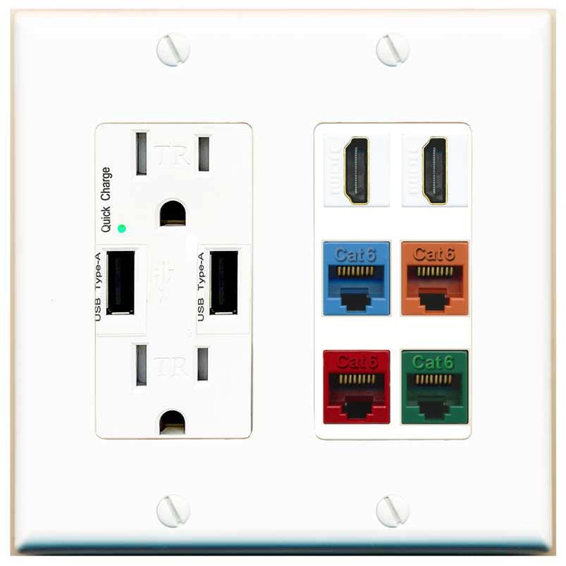 RiteAV 2 HDMI 4 Cat6 Ethernet Mixed Color Wall Plate - USB Charger [White/White]