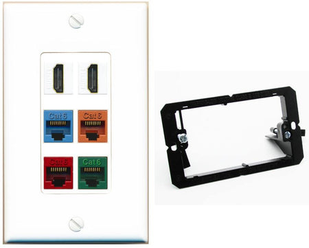 RiteAV 2 HDMI 4 Cat6 Ethernet Mixed Color Wall Plate - 1 Gang w-Bracket [White/White]