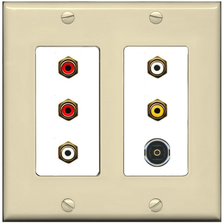 RiteAV 5 RCA (2 Red, 2 White, 1 Yellow) Toslink Wall Plate - 2 Gang [Ivory/White]