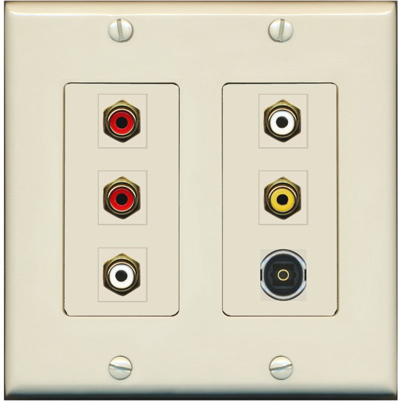 RiteAV 5 RCA (2 Red, 2 White, 1 Yellow) Toslink Wall Plate - 2 Gang [Light-Almond]