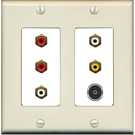 RiteAV 5 RCA (2 Red, 2 White, 1 Yellow) Toslink Wall Plate - 2 Gang [Light-Almond/White]
