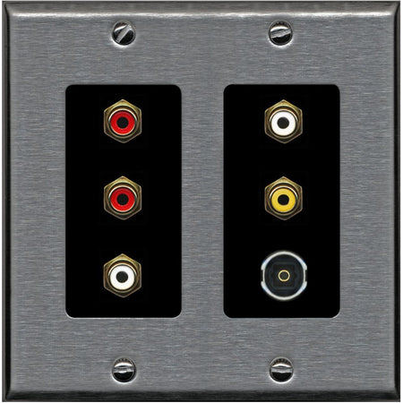 RiteAV 5 RCA (2 Red, 2 White, 1 Yellow) Toslink Wall Plate - 2 Gang [Stainless/Black]
