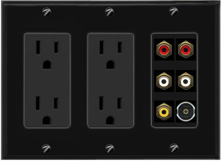 RiteAV 5 RCA (2 Red, 2 White, 1 Yellow) Toslink Wall Plate - 3 Gang 2 Outlet [Black/Black]